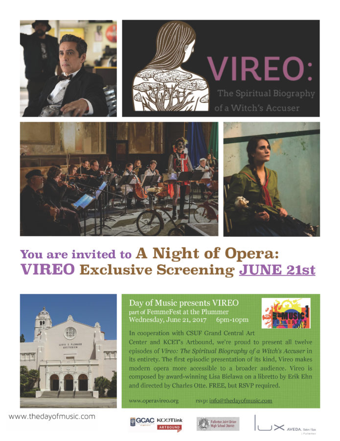 As part of Day of Music’s “FemmeFest at Plummer” we are proud to present an Exclusive SoCal Screening of Vireo, The Spiritual Biography of a Witch’s Accuser. Experience all 12 episodes (with two intermissions) of this avant garde production for the FIRST time on the big screen. With guest appearances and intro by award-winning composer-vocalist Lisa Bielawa, Vireo lead Rowen Sabala, tenor Ryan Joseph Glover, CSUF Grand Central Art Center director John Spiak, among others.